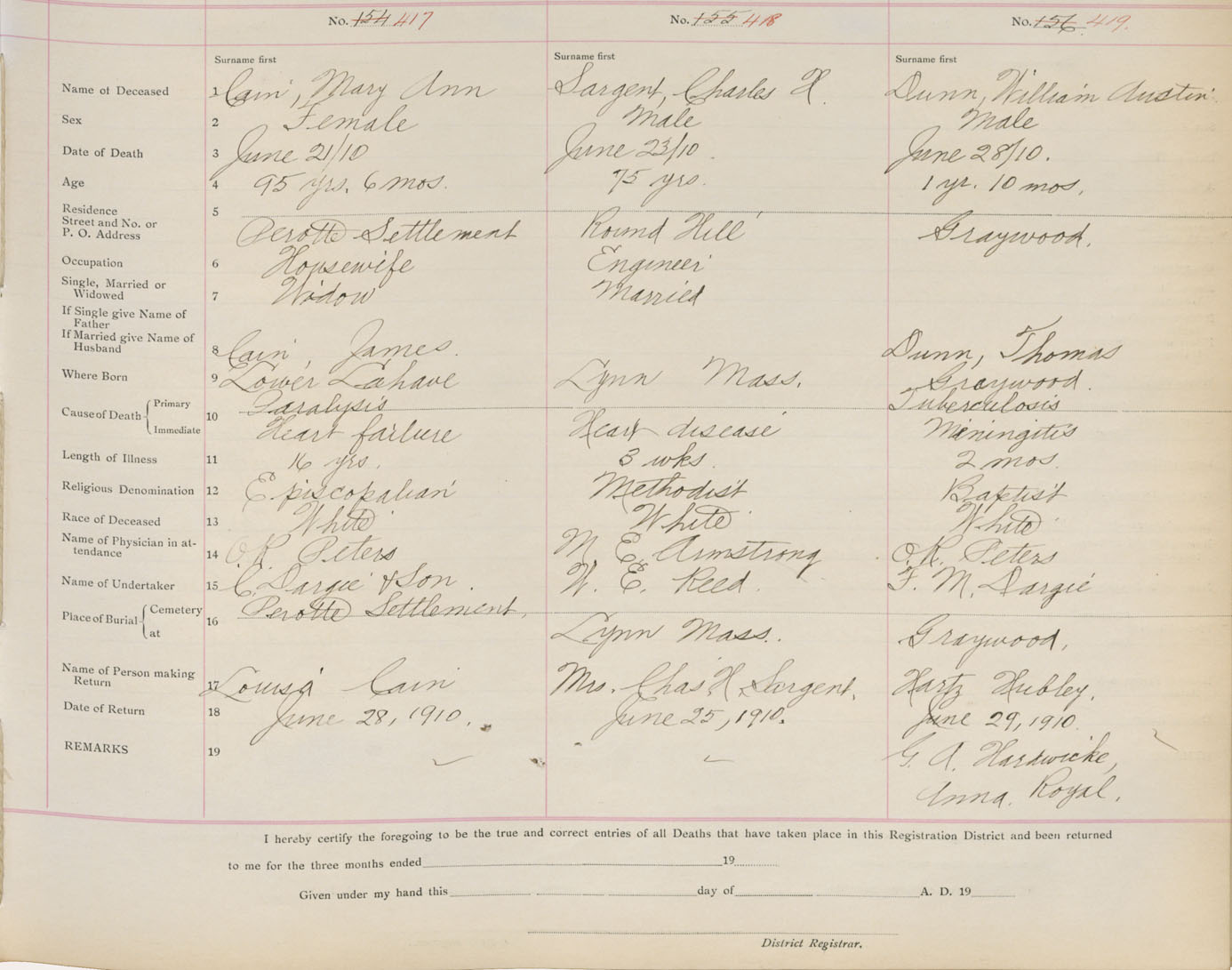 Death Registration: Year: 1910 book: 1 page: 70 number: 417