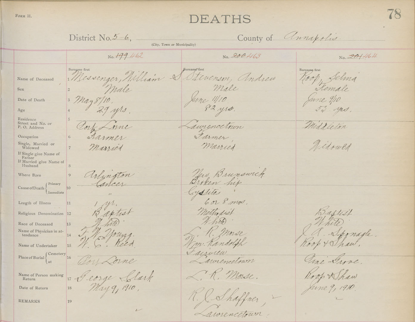 Death Registration: Year: 1910 book: 1 page: 78 number: 462