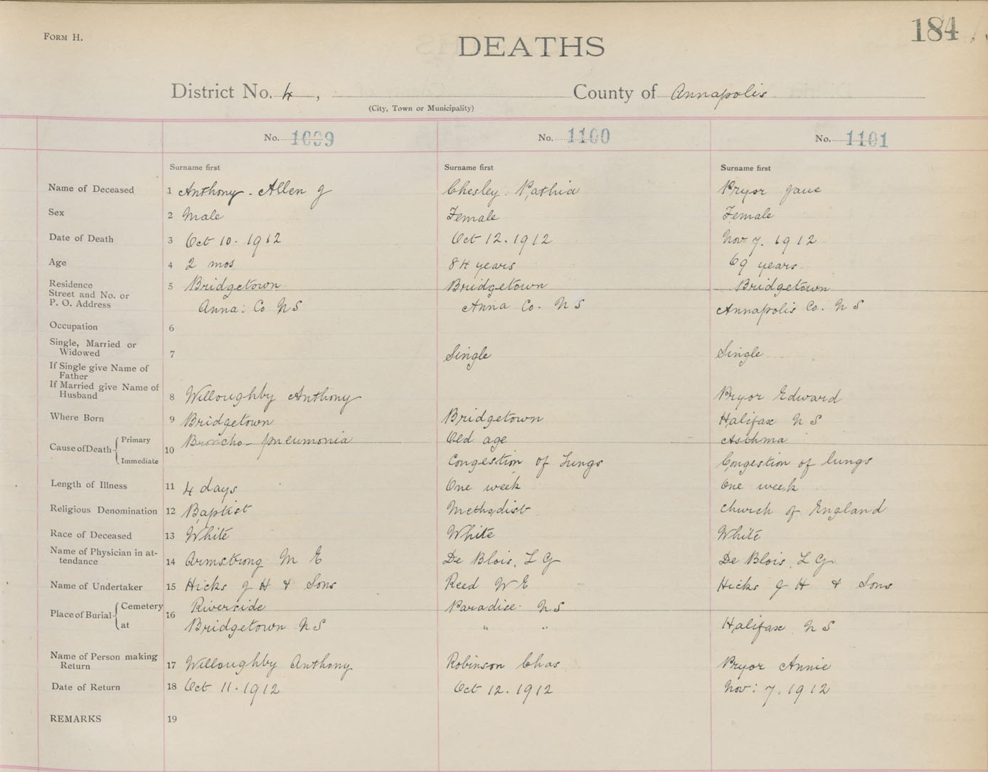 Death Registration: Year: 1912 book: 1 page: 184 number: 1101