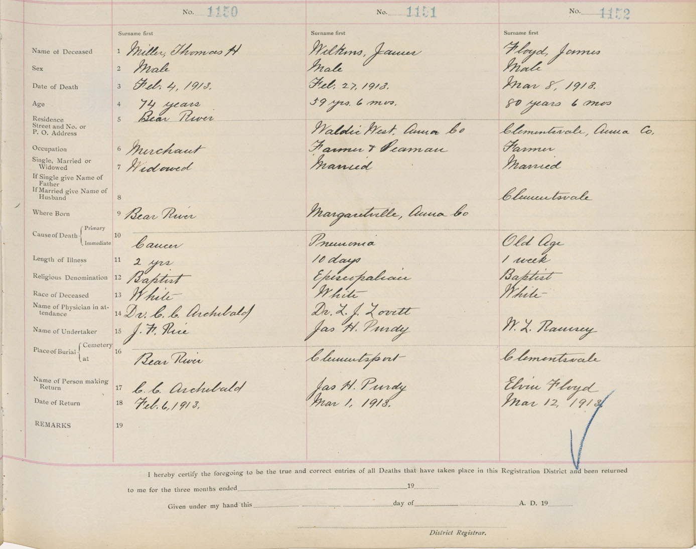 Death Registration: Year: 1913 book: 1 page: 192 number: 1152