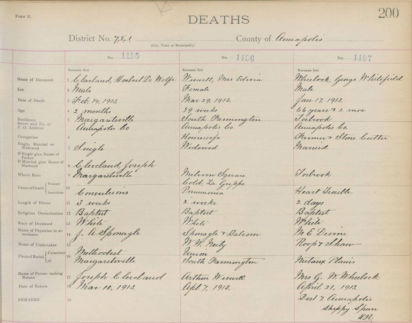 Death Registration: Year: 1913 book: 1 page: 200 number: 1197