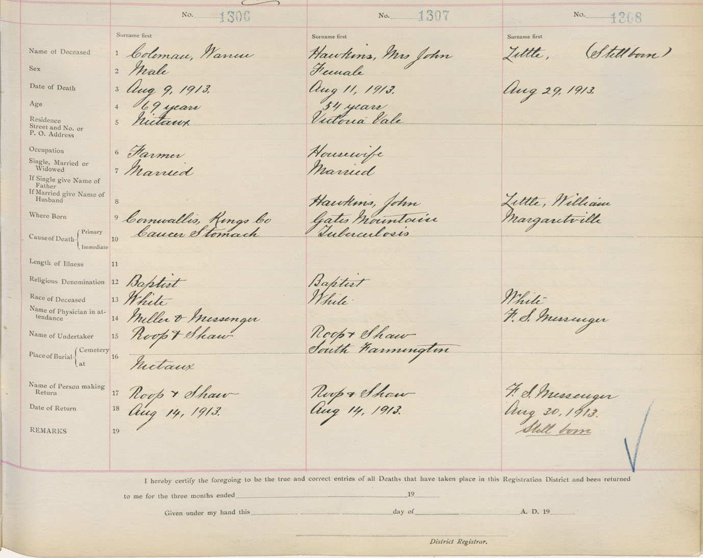 Death Registration: Year: 1913 book: 1 page: 218 number: 1308