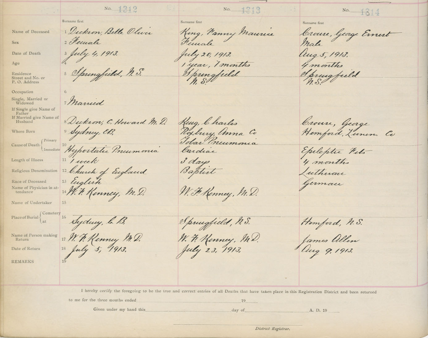 Death Registration: Year: 1913 book: 1 page: 219 number: 1314