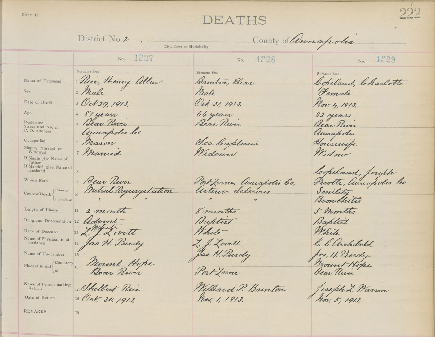 Death Registration: Year: 1913 book: 1 page: 222 number: 1329