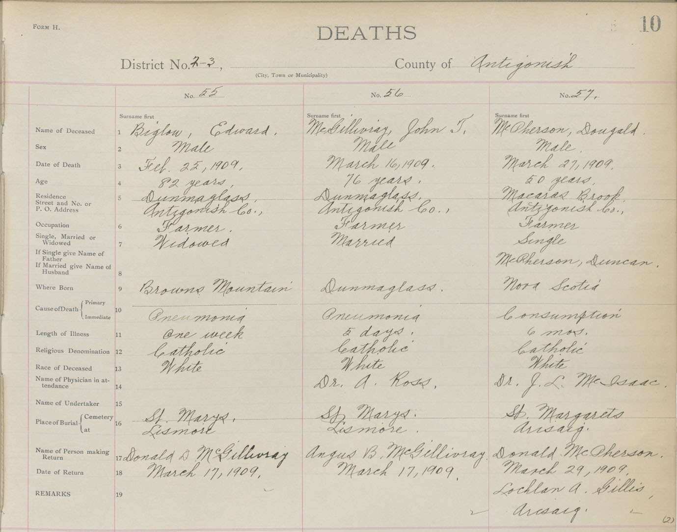 Male Death Registration: Year: 1909 book: 2 page: 10 number: 57