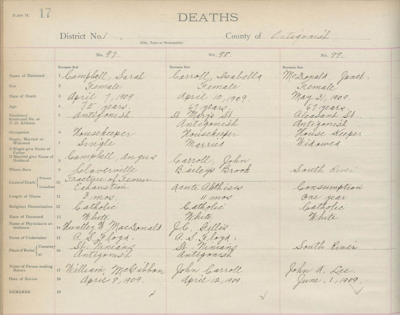 Female Death Registration: Year: 1909 book: 2 page: 17 number: 97