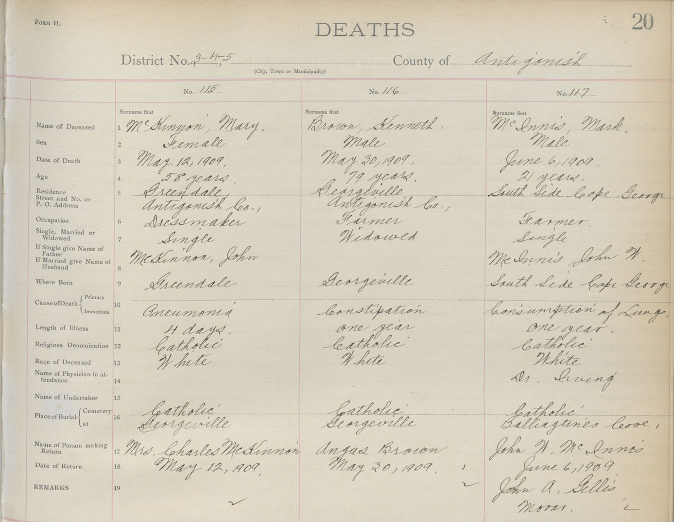 Death Registration: Year: 1909 book: 2 page: 20 number: 115