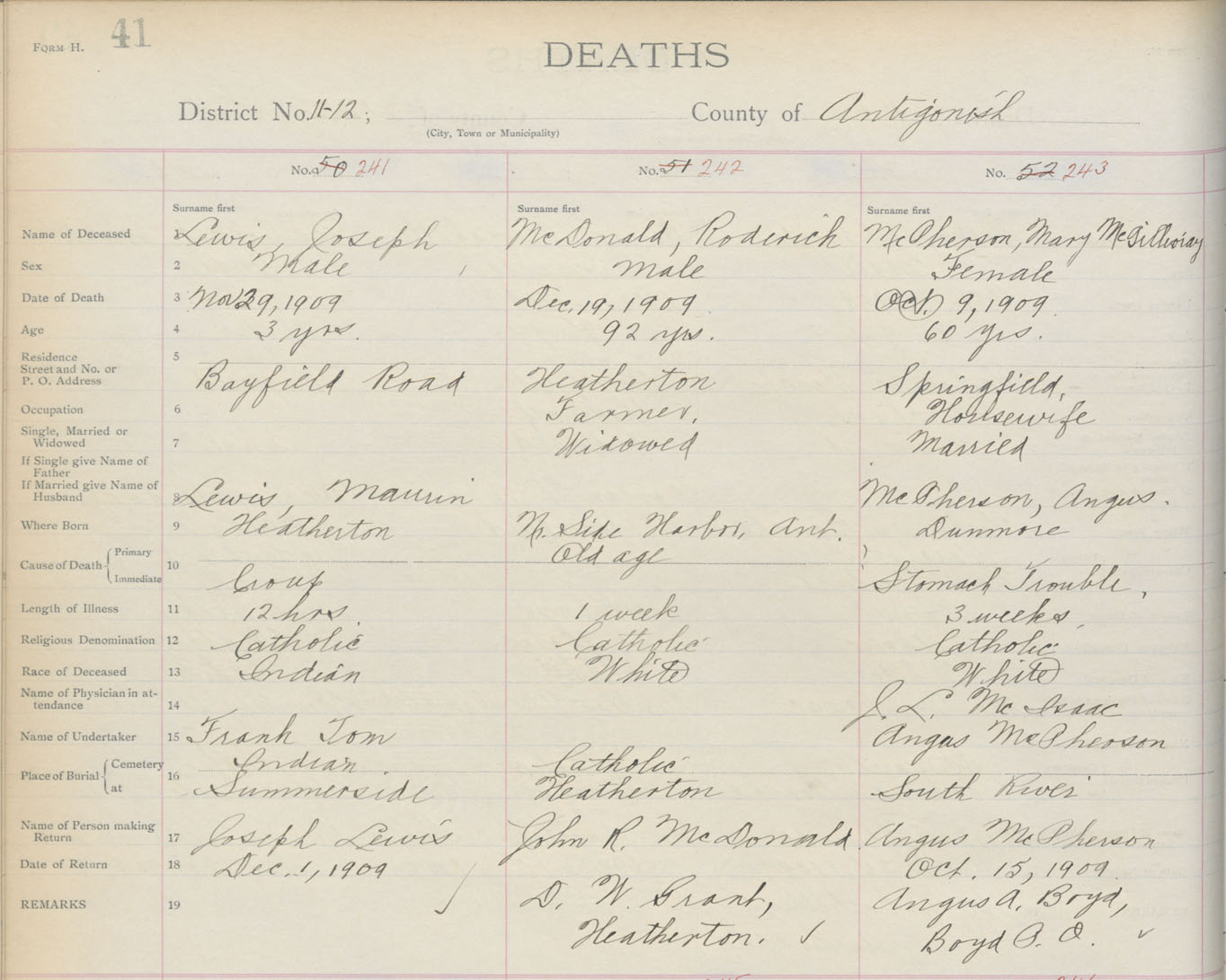 Death Registration: Year: 1909 book: 2 page: 41 number: 241