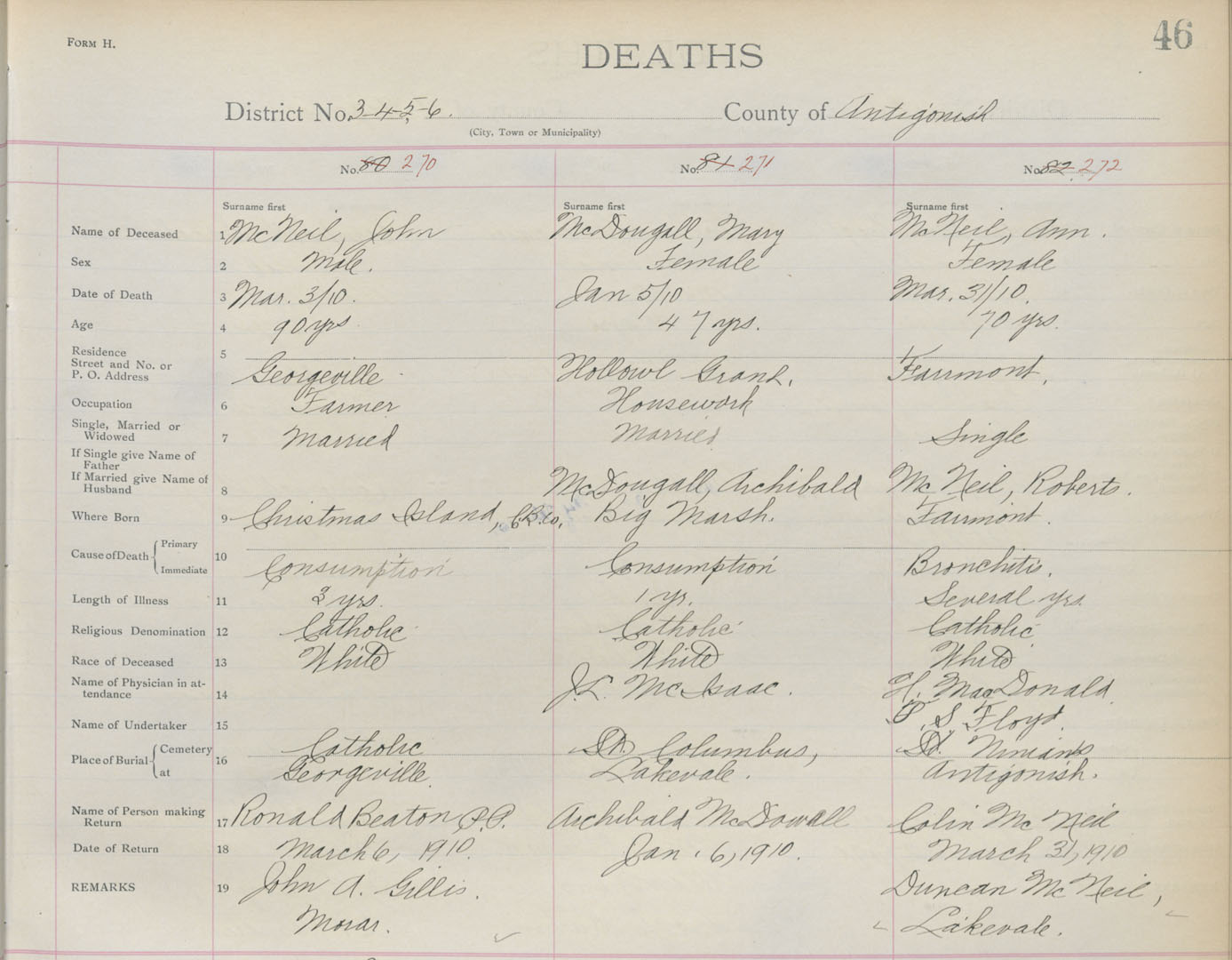 Death Registration: Year: 1910 book: 2 page: 46 number: 270