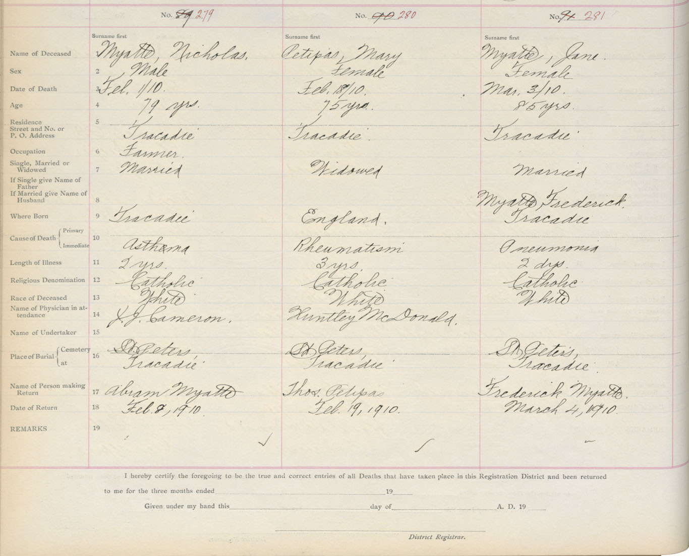 Death Registration: Year: 1910 book: 2 page: 47 number: 279