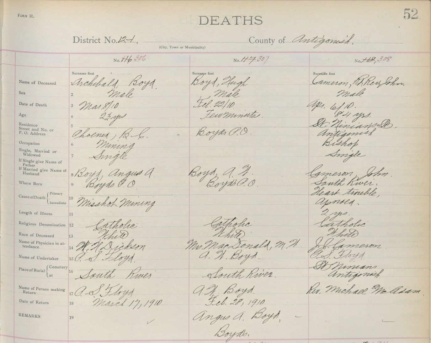 Death Registration: Year: 1910 book: 2 page: 52 number: 306