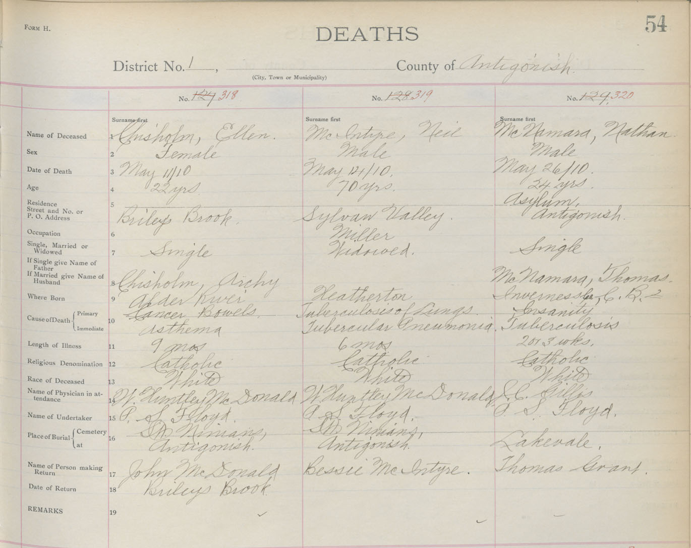 Death Registration: Year: 1910 book: 2 page: 54 number: 318