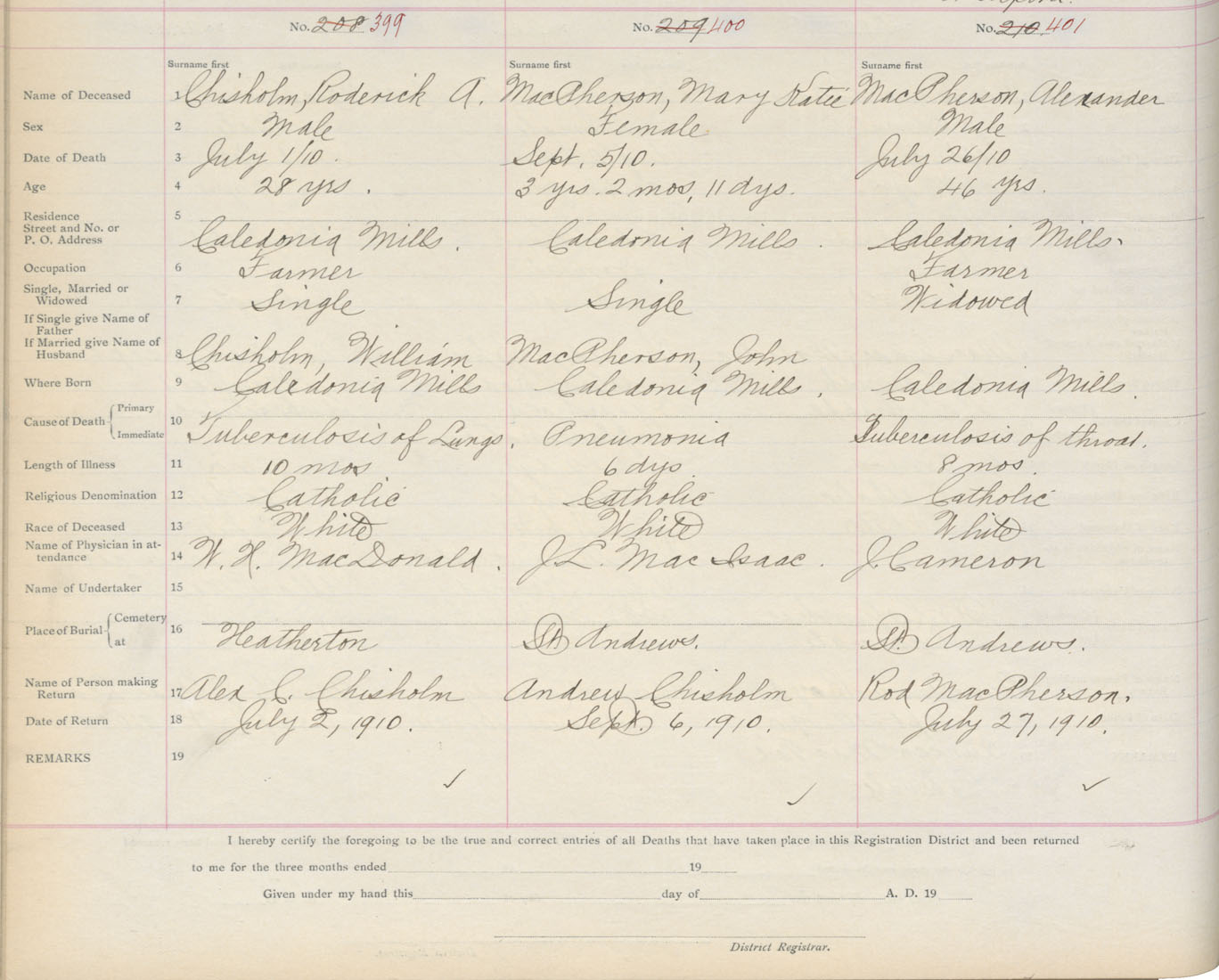 Death Registration: Year: 1910 book: 2 page: 67 number: 399