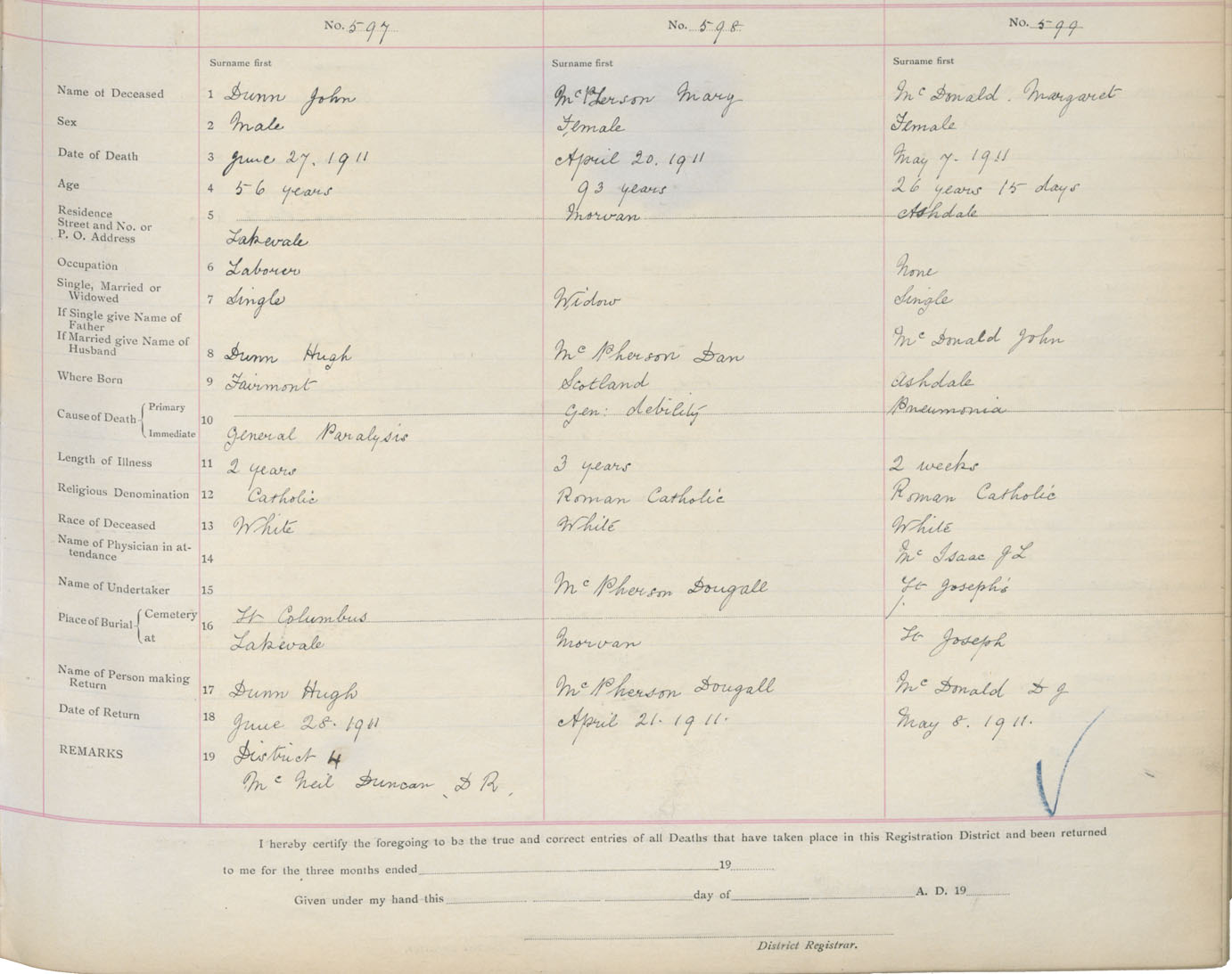 Death Registration: Year: 1911 book: 2 page: 100 number: 597