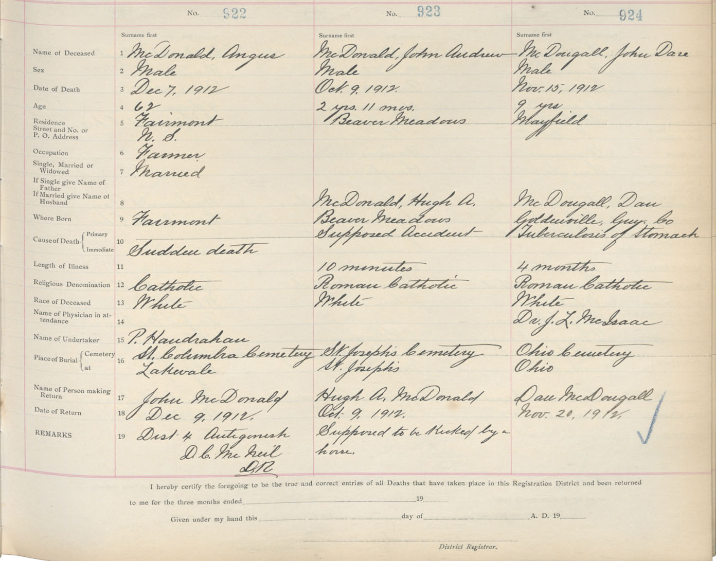 Death Registration: Year: 1912 book: 2 page: 154 number: 922