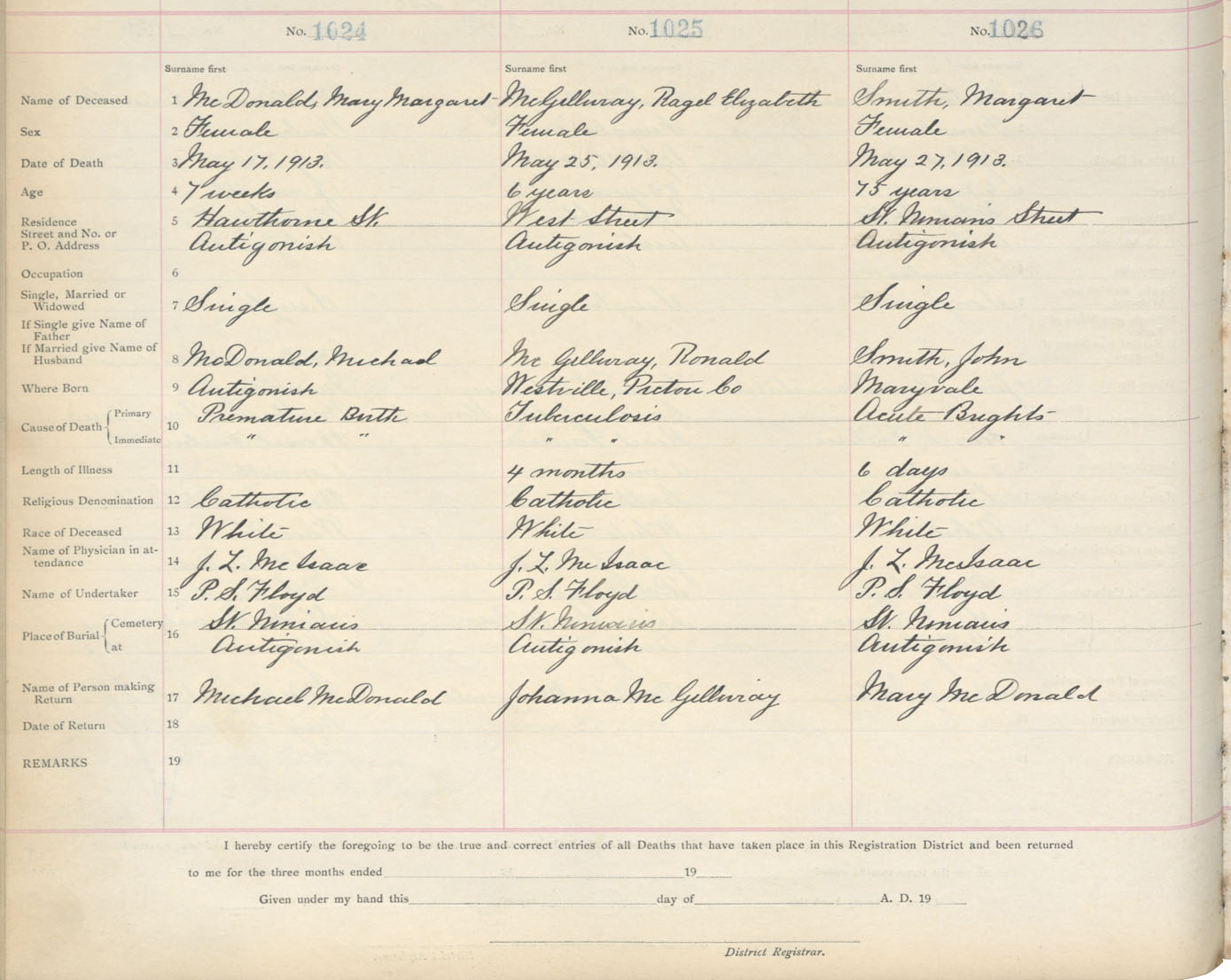 Female Death Registration: Year: 1913 book: 2 page: 171 number: 1024