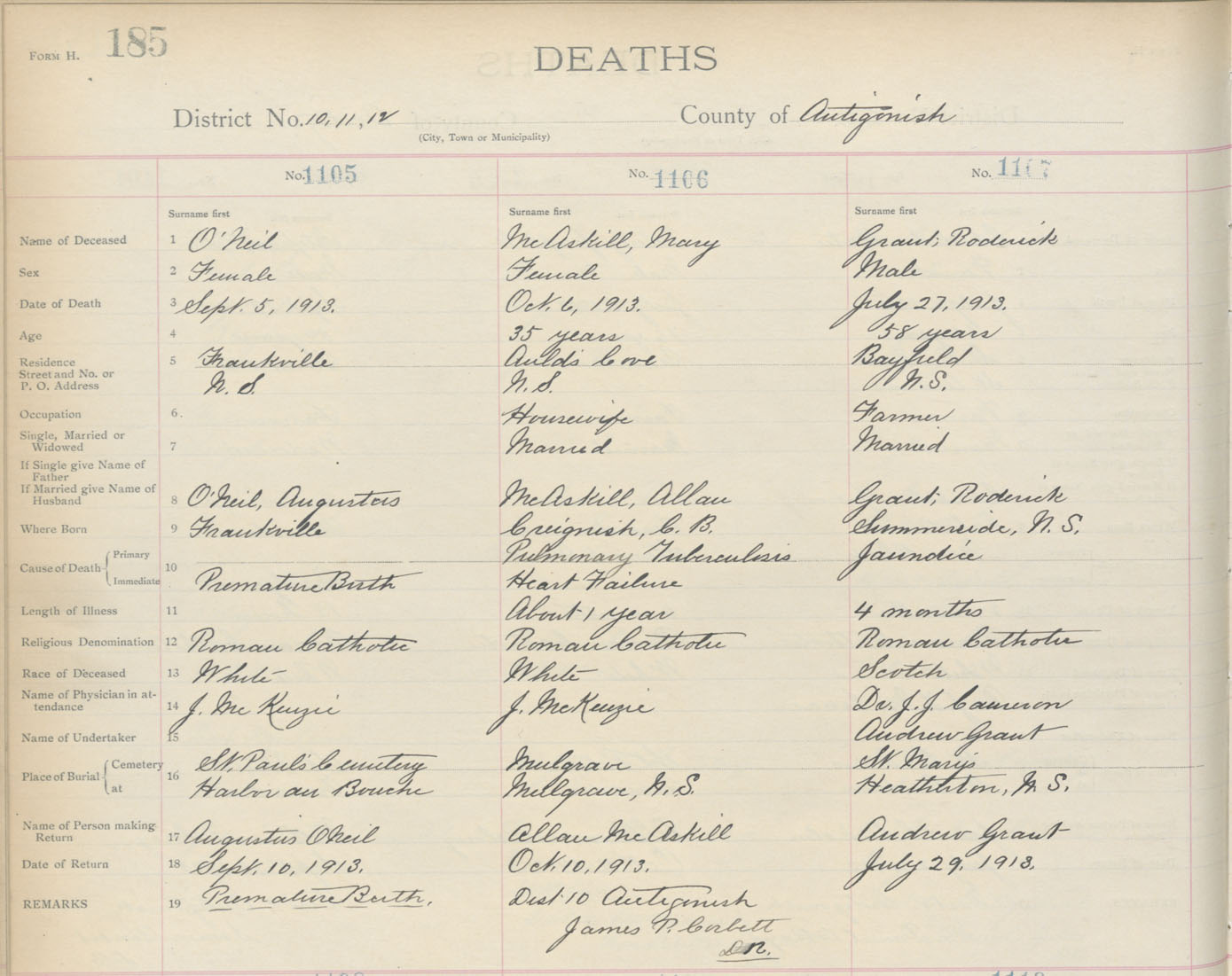 Death Registration: Year: 1913 book: 2 page: 185 number: 1107