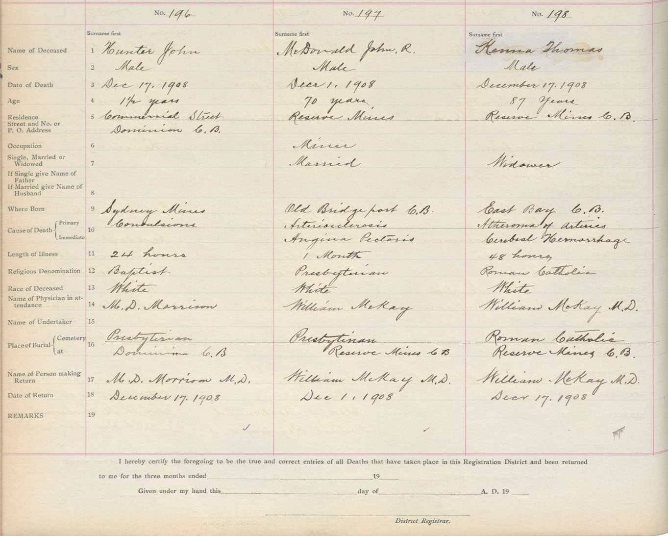 Death Registration: Year: 1908 book: 3 page: 33 number: 197