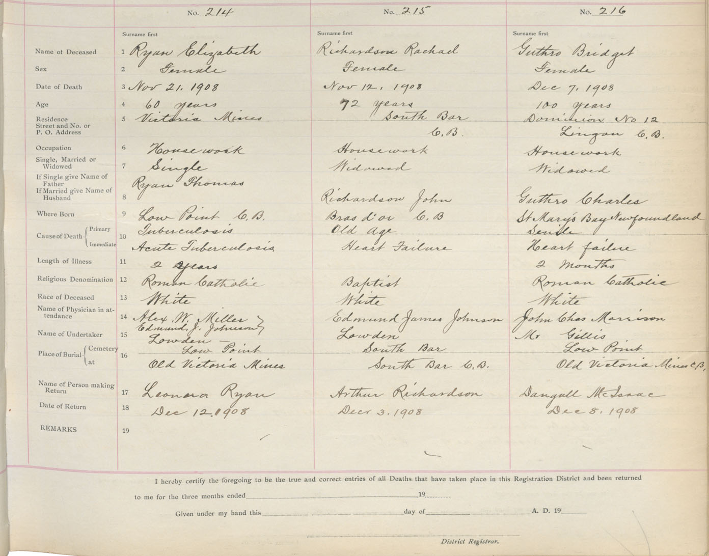 Death Registration: Year: 1908 book: 3 page: 36 number: 214