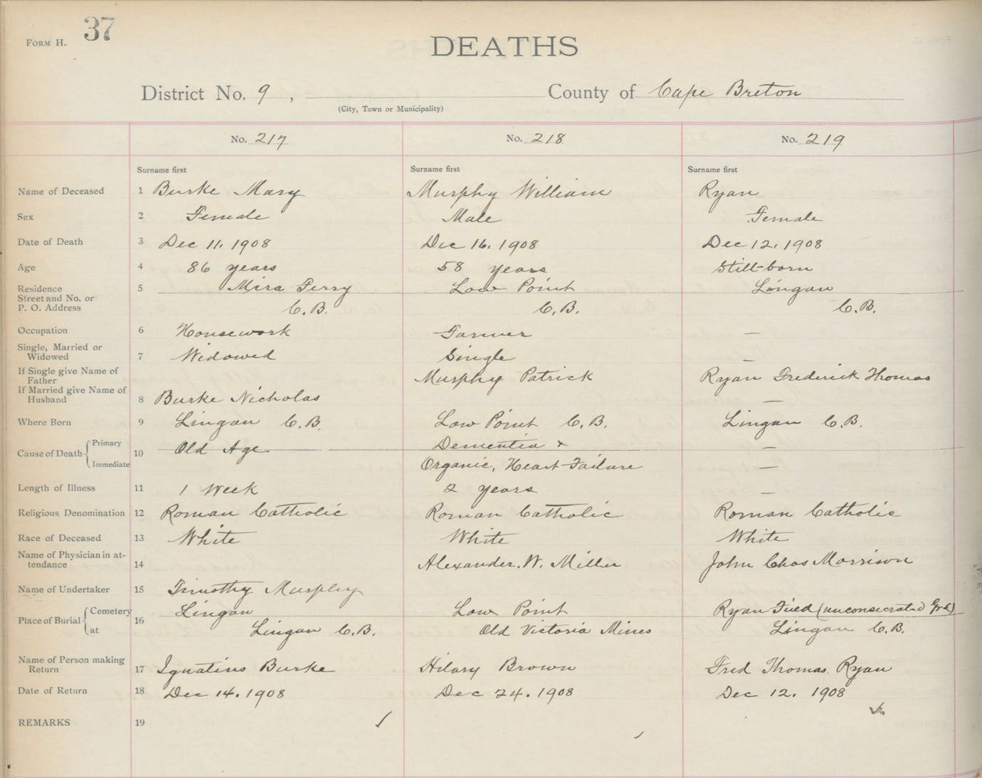 Death Registration: Year: 1908 book: 3 page: 37 number: 217