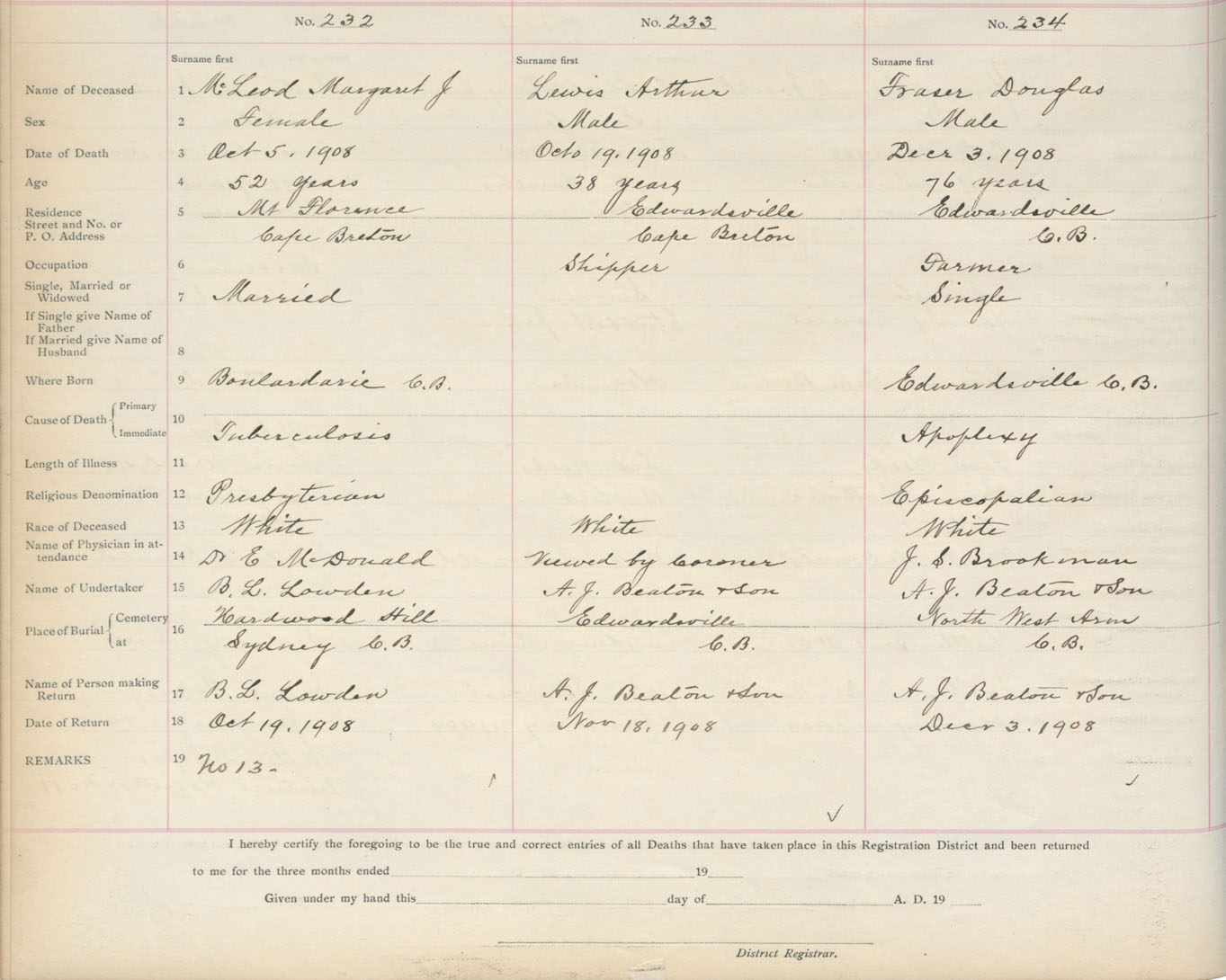 Death Registration: Year: 1908 book: 3 page: 39 number: 234