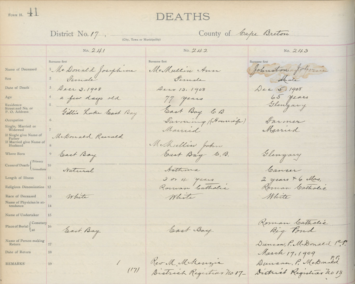 Death Registration: Year: 1908 book: 3 page: 41 number: 241