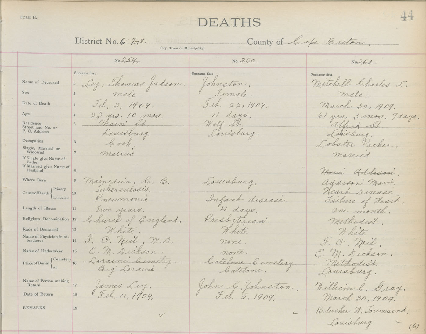 Death Registration: Year: 1909 book: 3 page: 44 number: 259