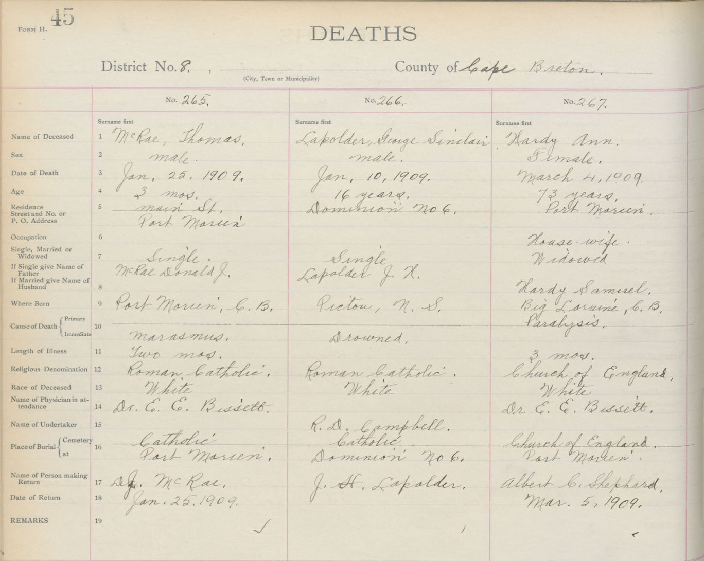 Death Registration: Year: 1909 book: 3 page: 45 number: 267