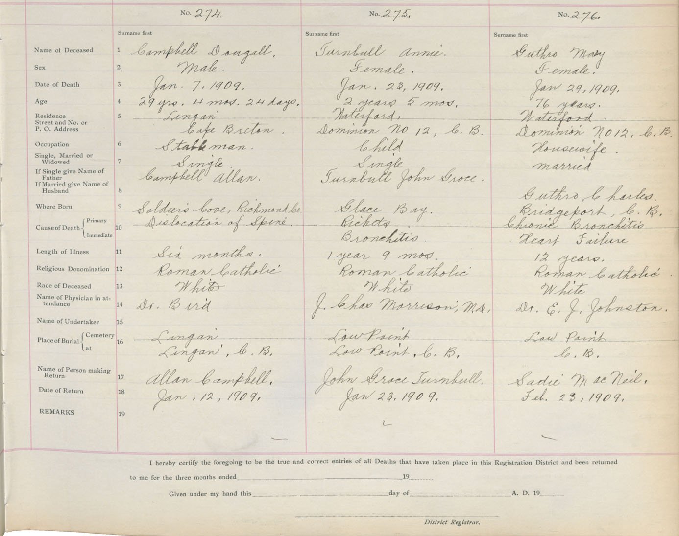 Death Registration: Year: 1909 book: 3 page: 46 number: 274