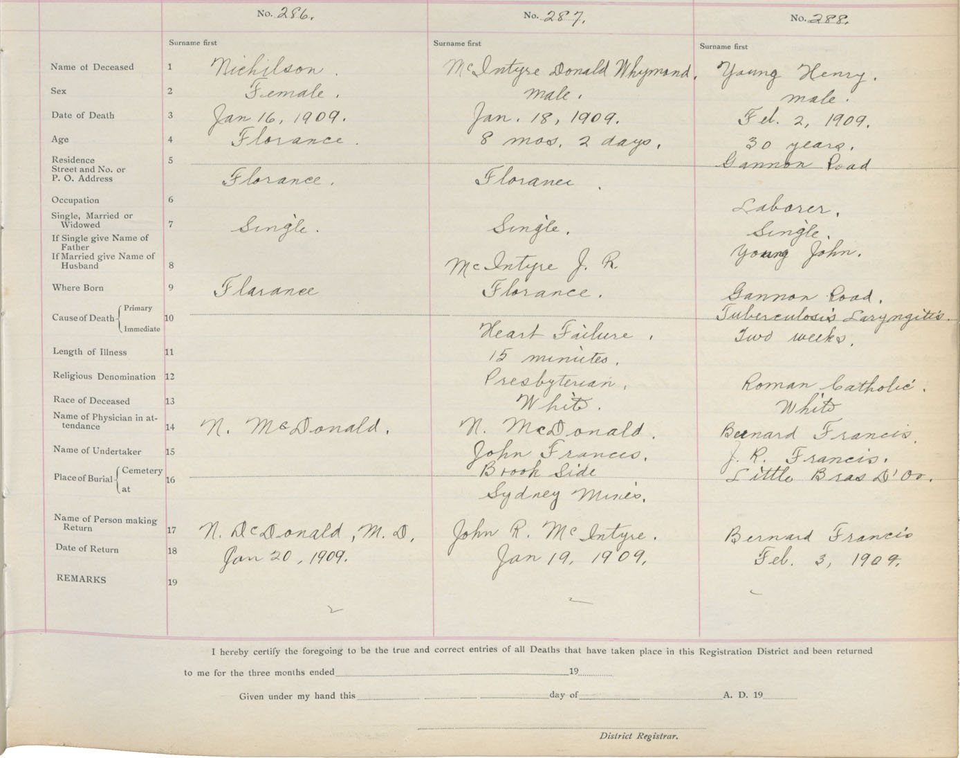 Death Registration: Year: 1909 book: 3 page: 48 number: 286