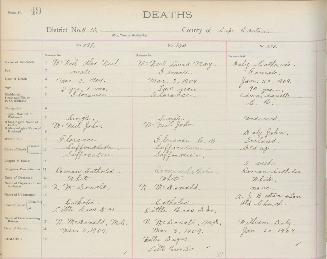 Death Registration: Year: 1909 book: 3 page: 49 number: 289