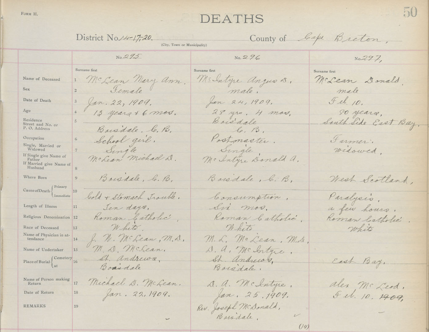 Death Registration: Year: 1909 book: 3 page: 50 number: 295