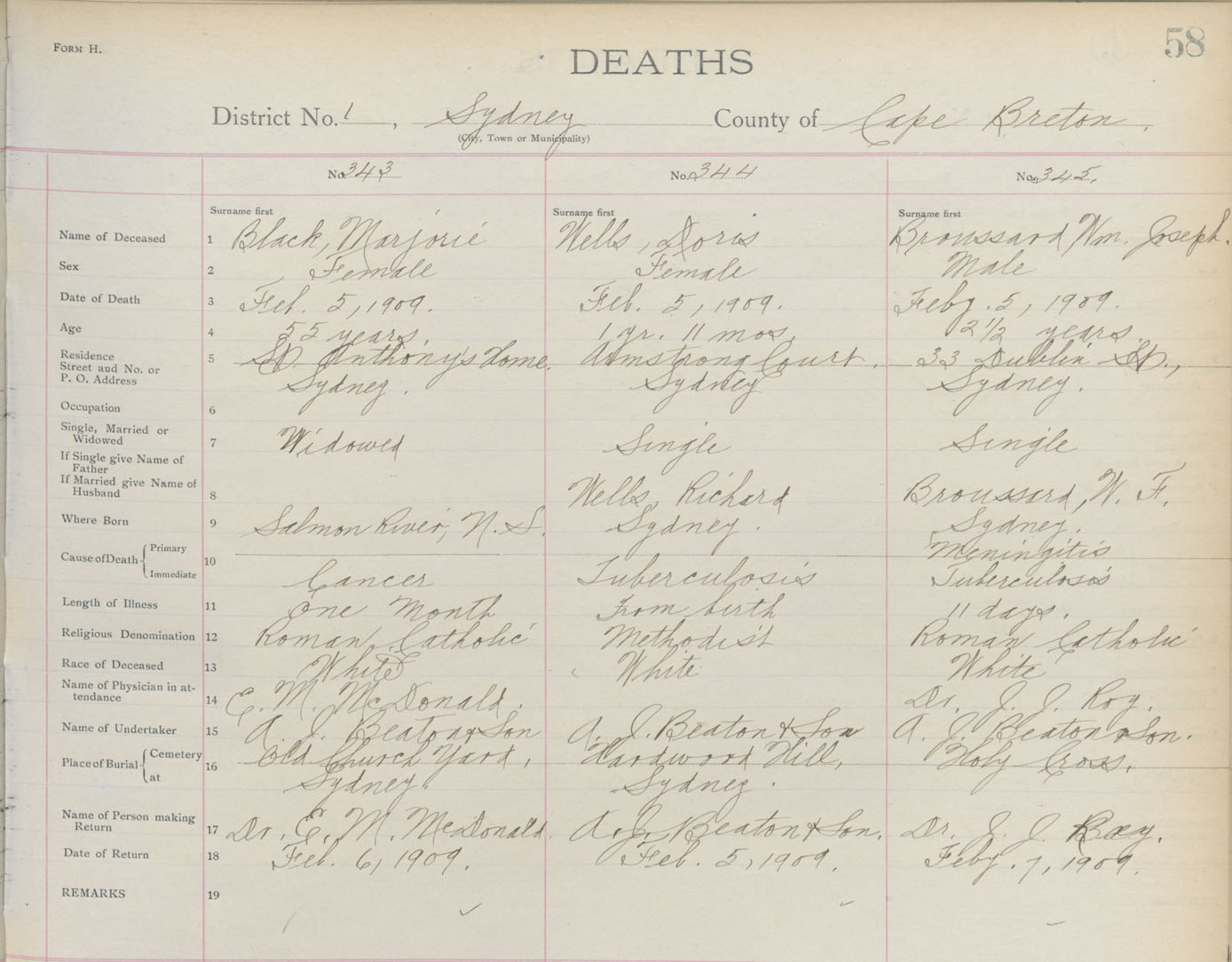 Death Registration: Year: 1909 book: 3 page: 58 number: 345