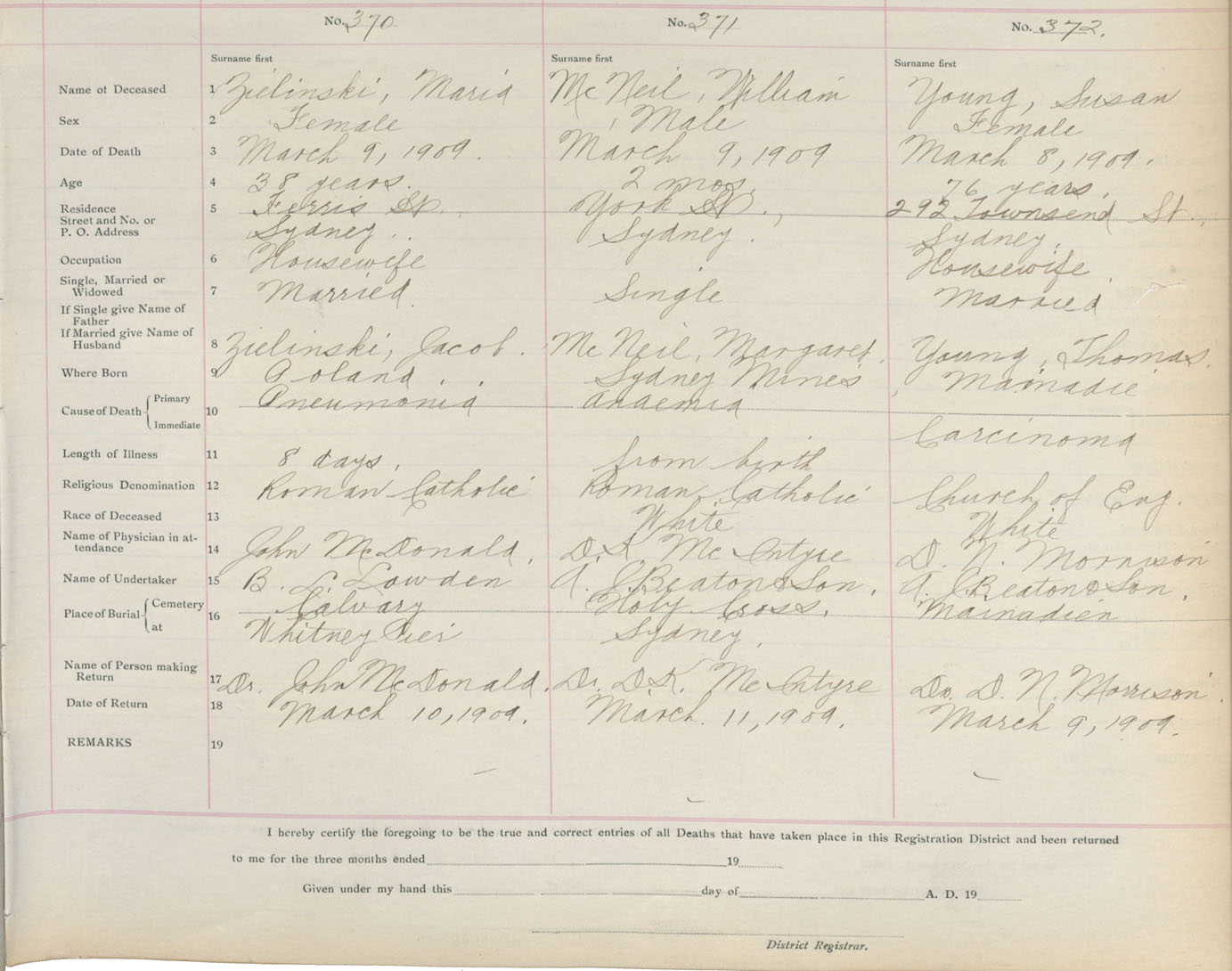 Death Registration: Year: 1909 book: 3 page: 62 number: 370