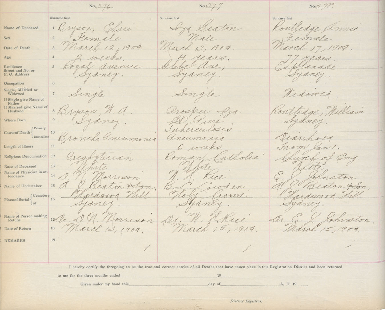 Death Registration: Year: 1909 book: 3 page: 63 number: 376
