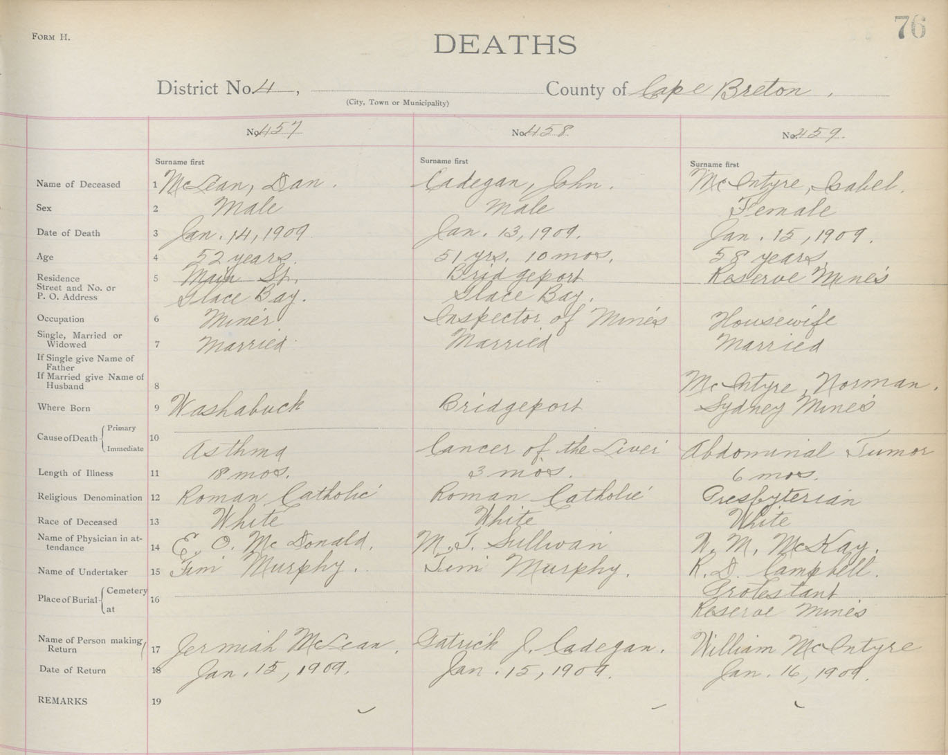 Death Registration: Year: 1909 book: 3 page: 76 number: 459