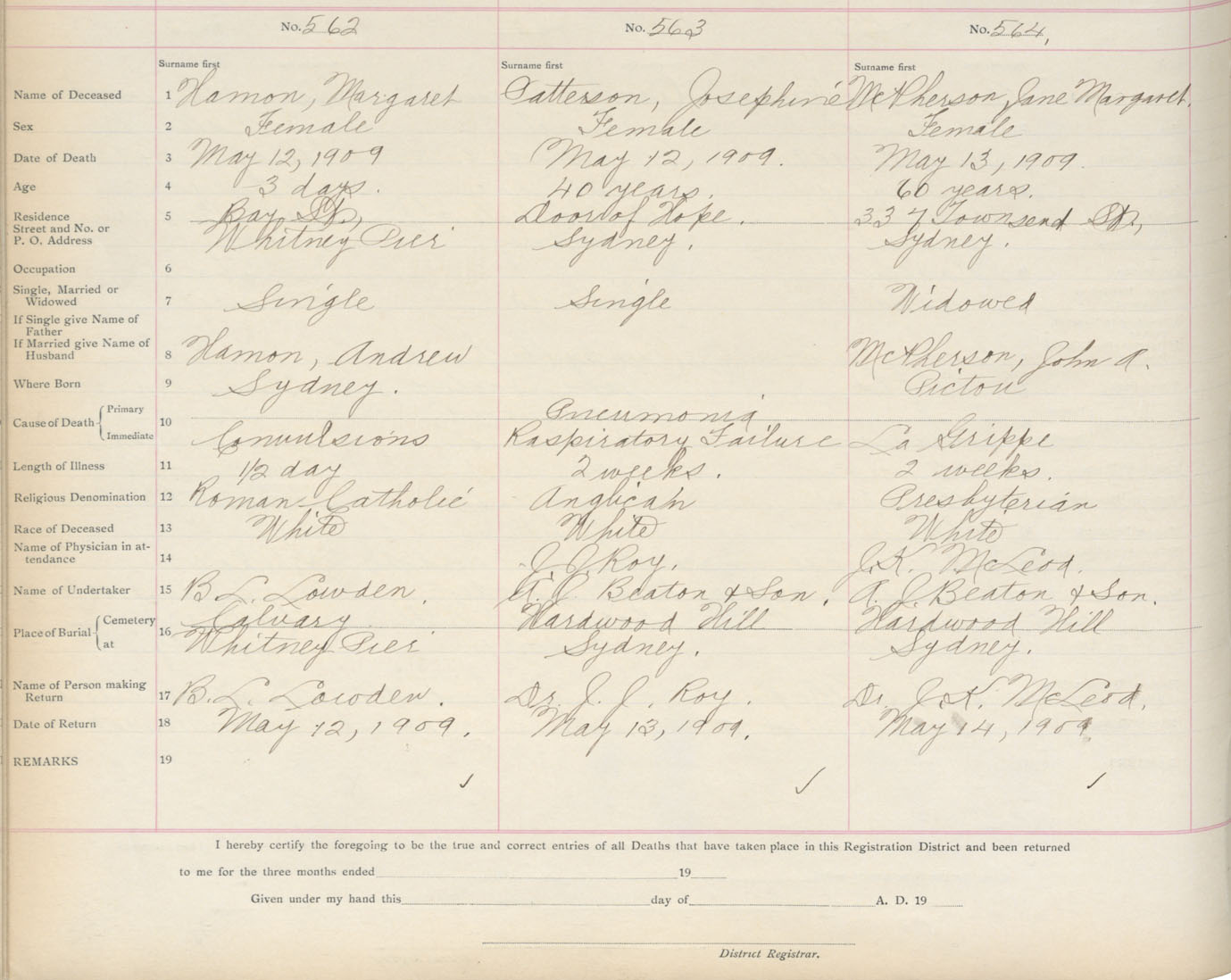 Death Registration: Year: 1909 book: 3 page: 93 number: 562