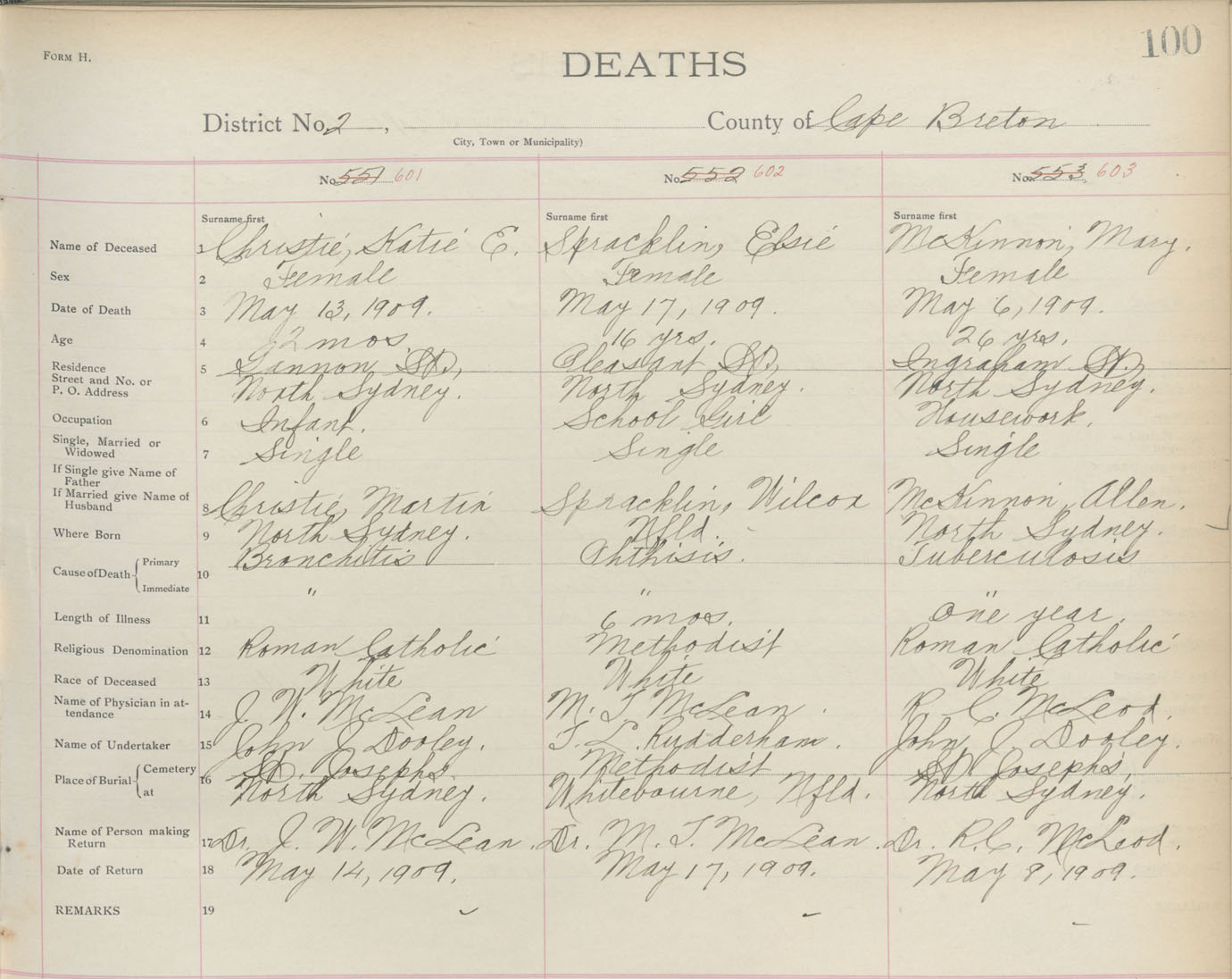 Death Registration: Year: 1909 book: 3 page: 100 number: 601