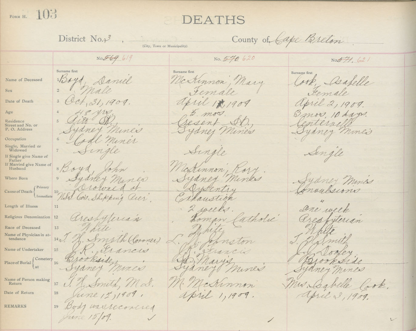 Death Registration: Year: 1909 book: 3 page: 103 number: 619