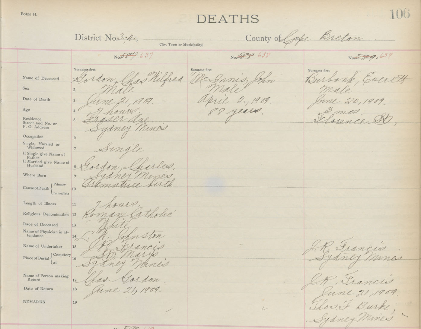 Death Registration: Year: 1909 book: 3 page: 106 number: 637