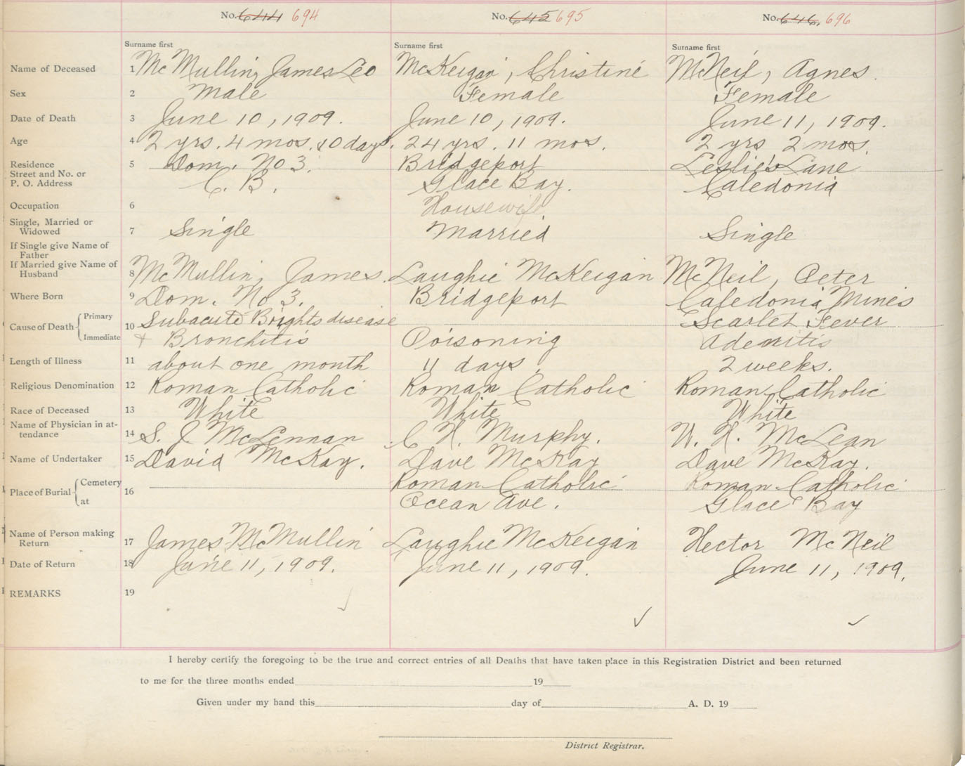 Death Registration: Year: 1909 book: 3 page: 115 number: 696