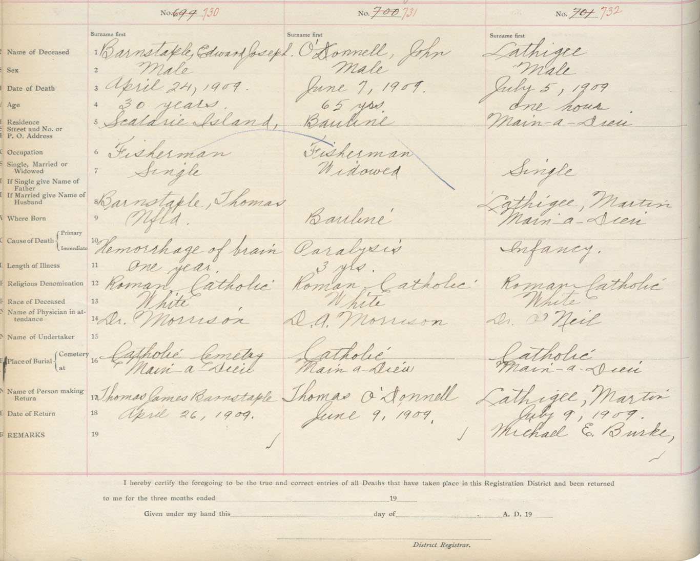 Male Death Registration: Year: 1909 book: 3 page: 121 number: 732