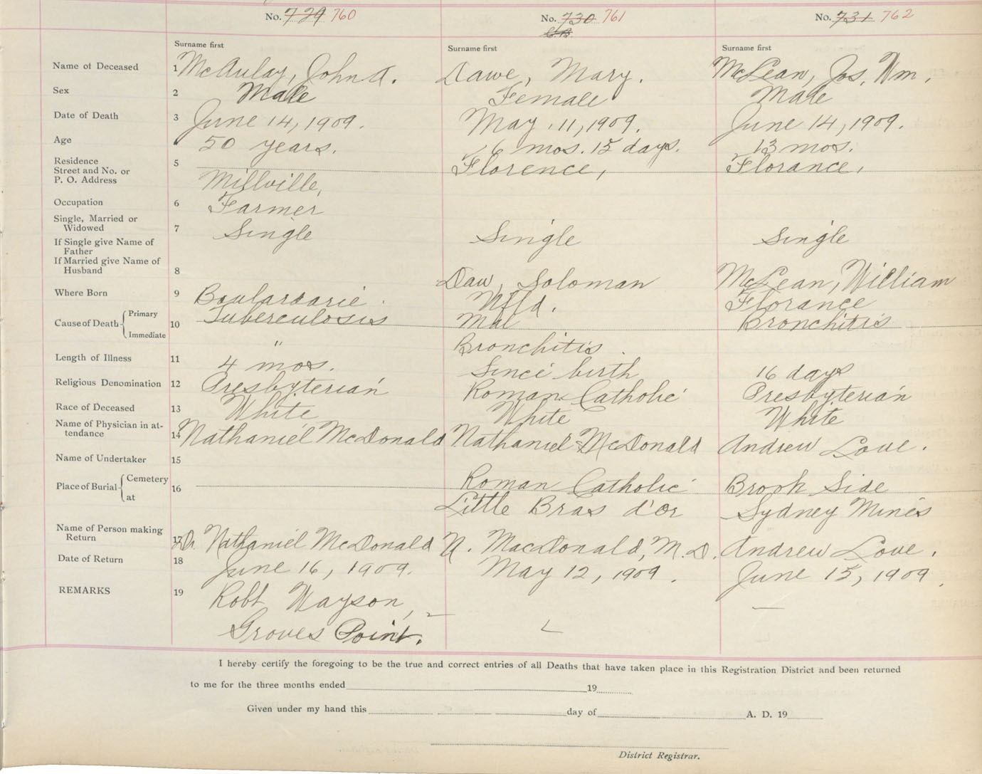 Death Registration: Year: 1909 book: 3 page: 126 number: 762