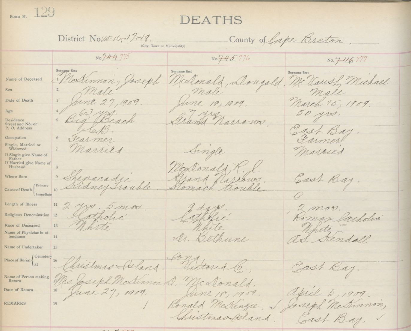 Death Registration: Year: 1909 book: 3 page: 129 number: 775