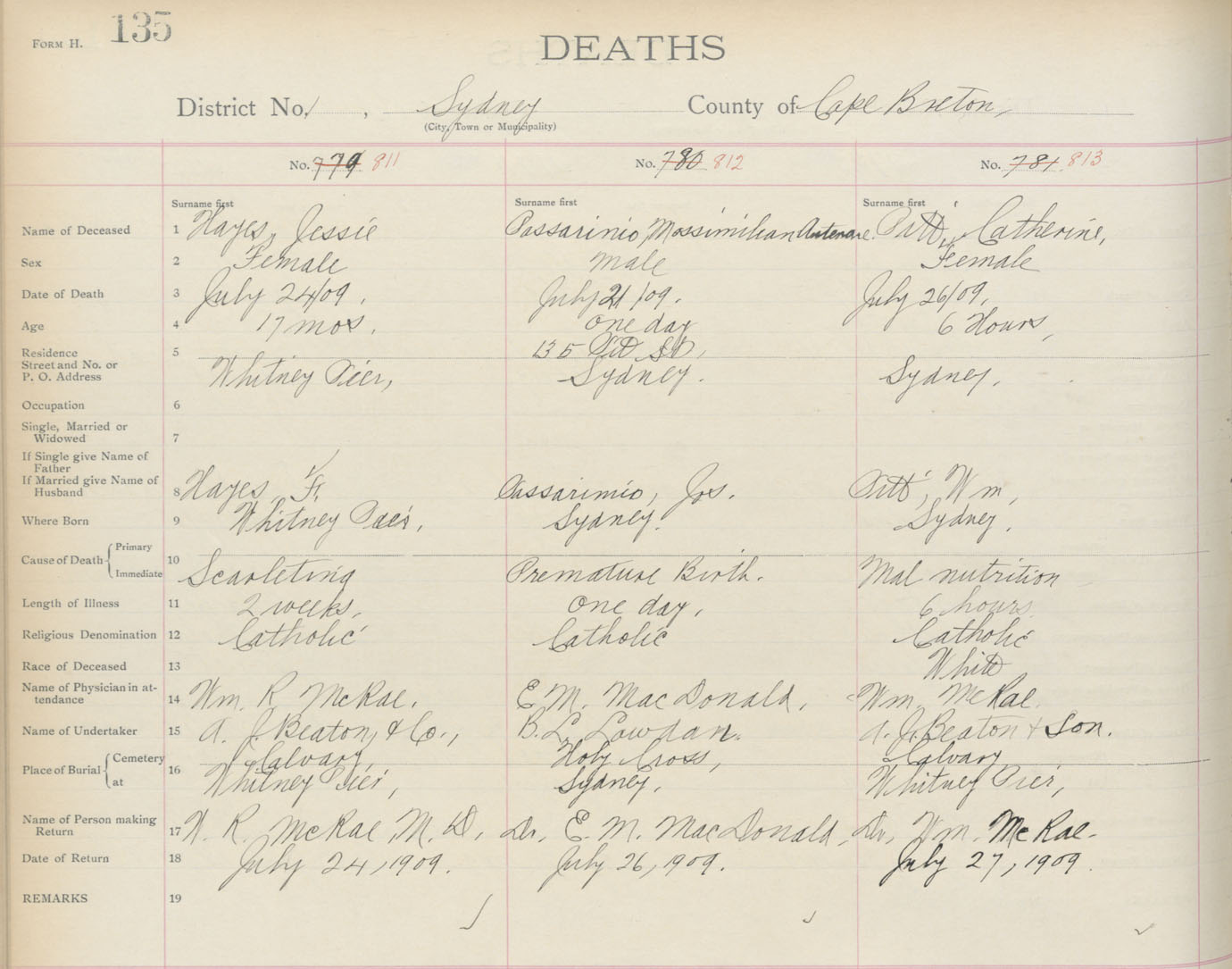 Death Registration: Year: 1909 book: 3 page: 135 number: 811