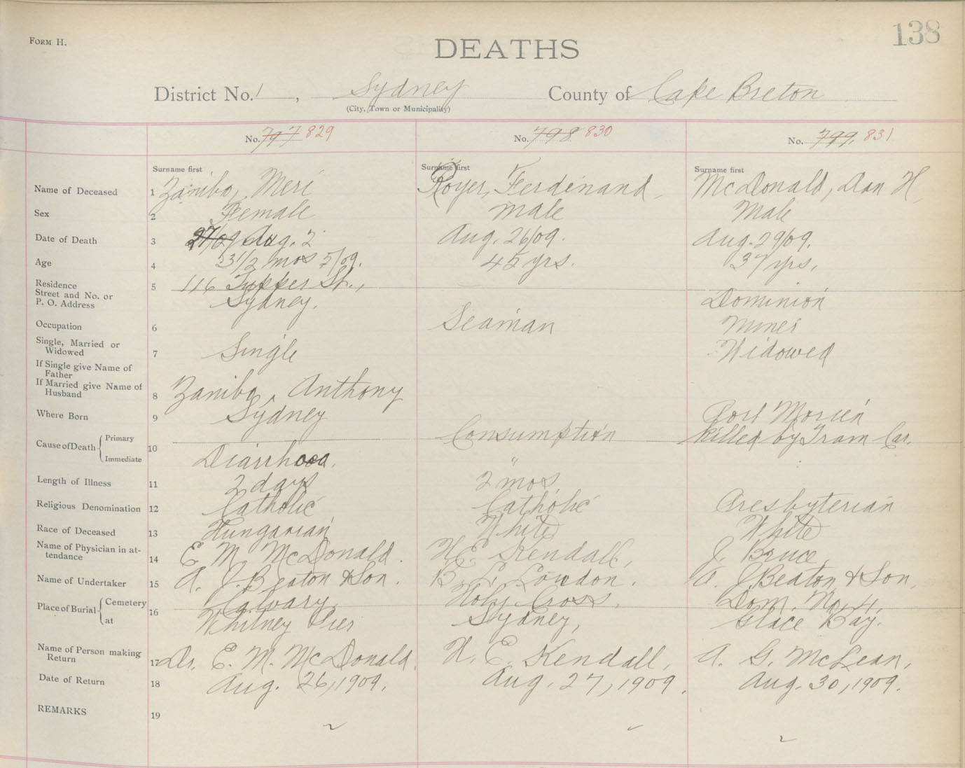 Death Registration: Year: 1909 book: 3 page: 138 number: 829