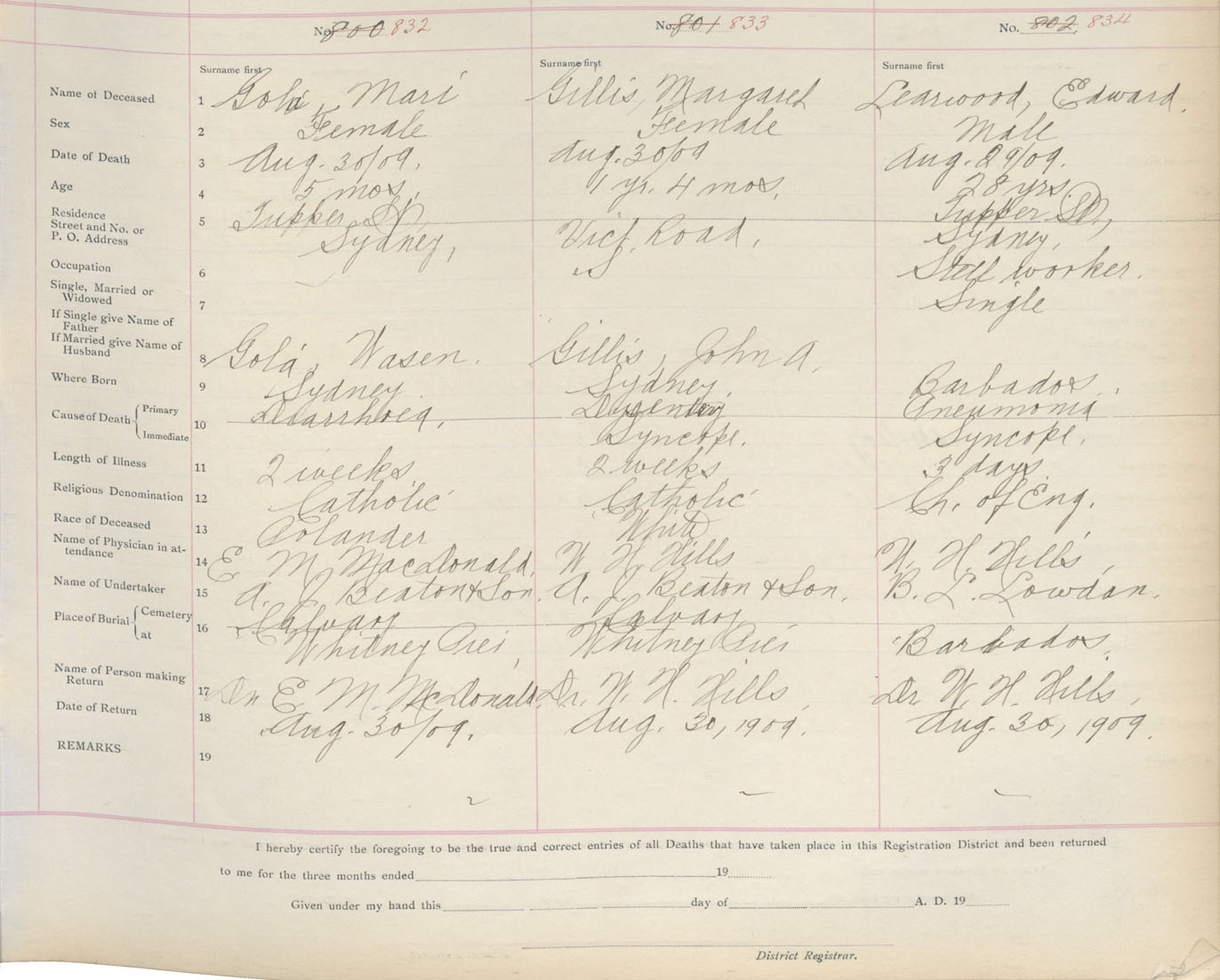 Death Registration: Year: 1909 book: 3 page: 138 number: 832