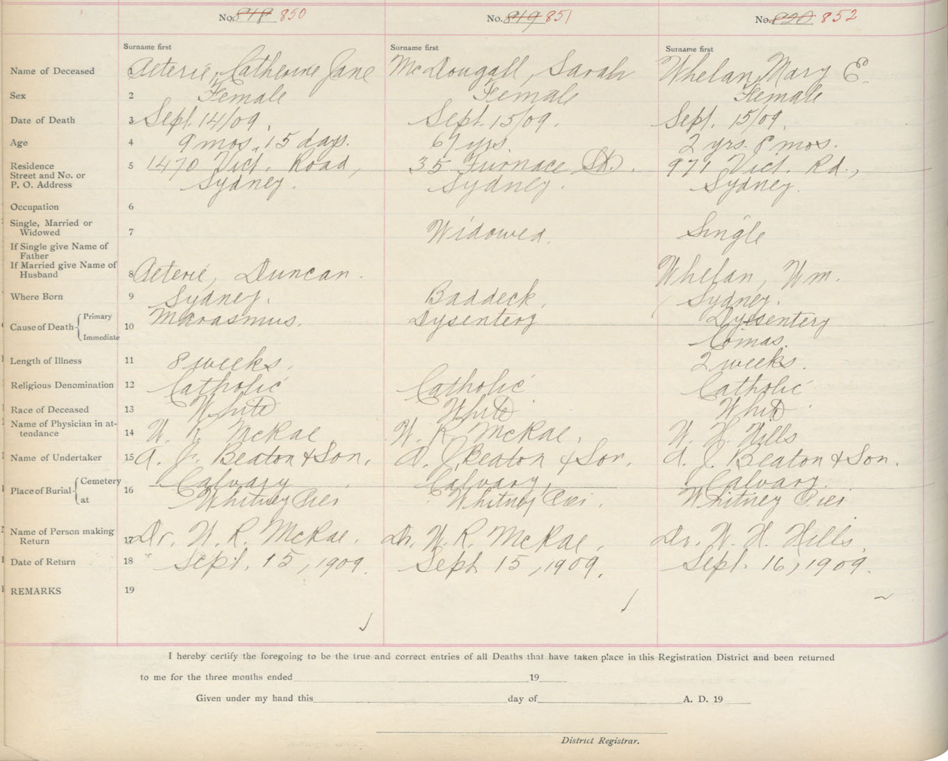 Death Registration: Year: 1909 book: 3 page: 141 number: 850