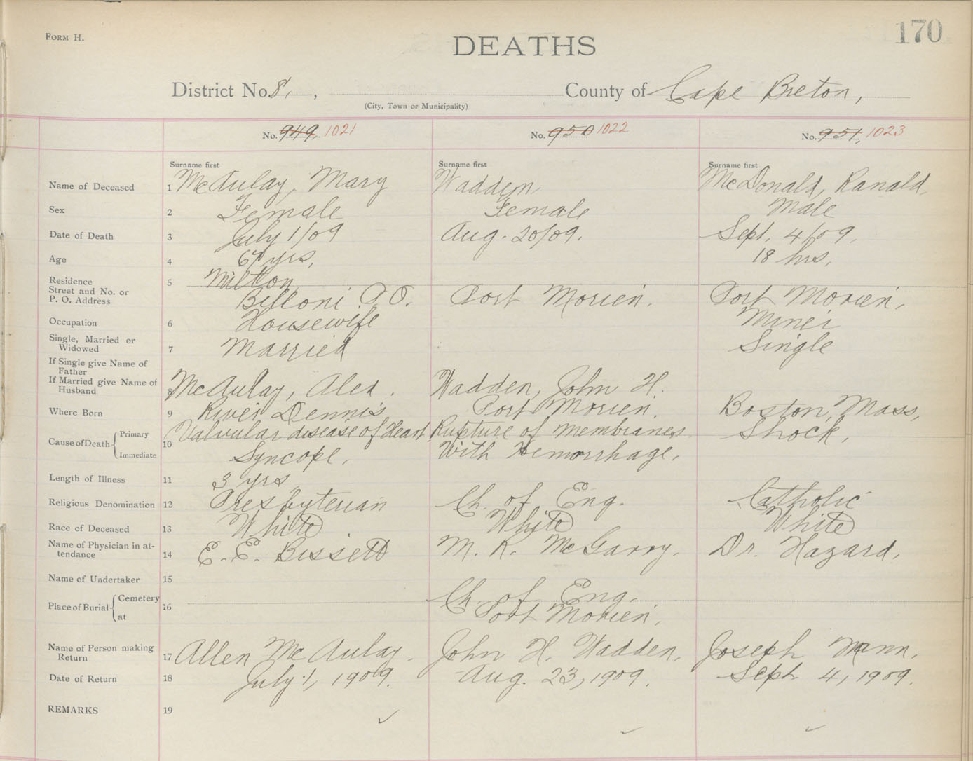 Death Registration: Year: 1909 book: 3 page: 170 number: 1023