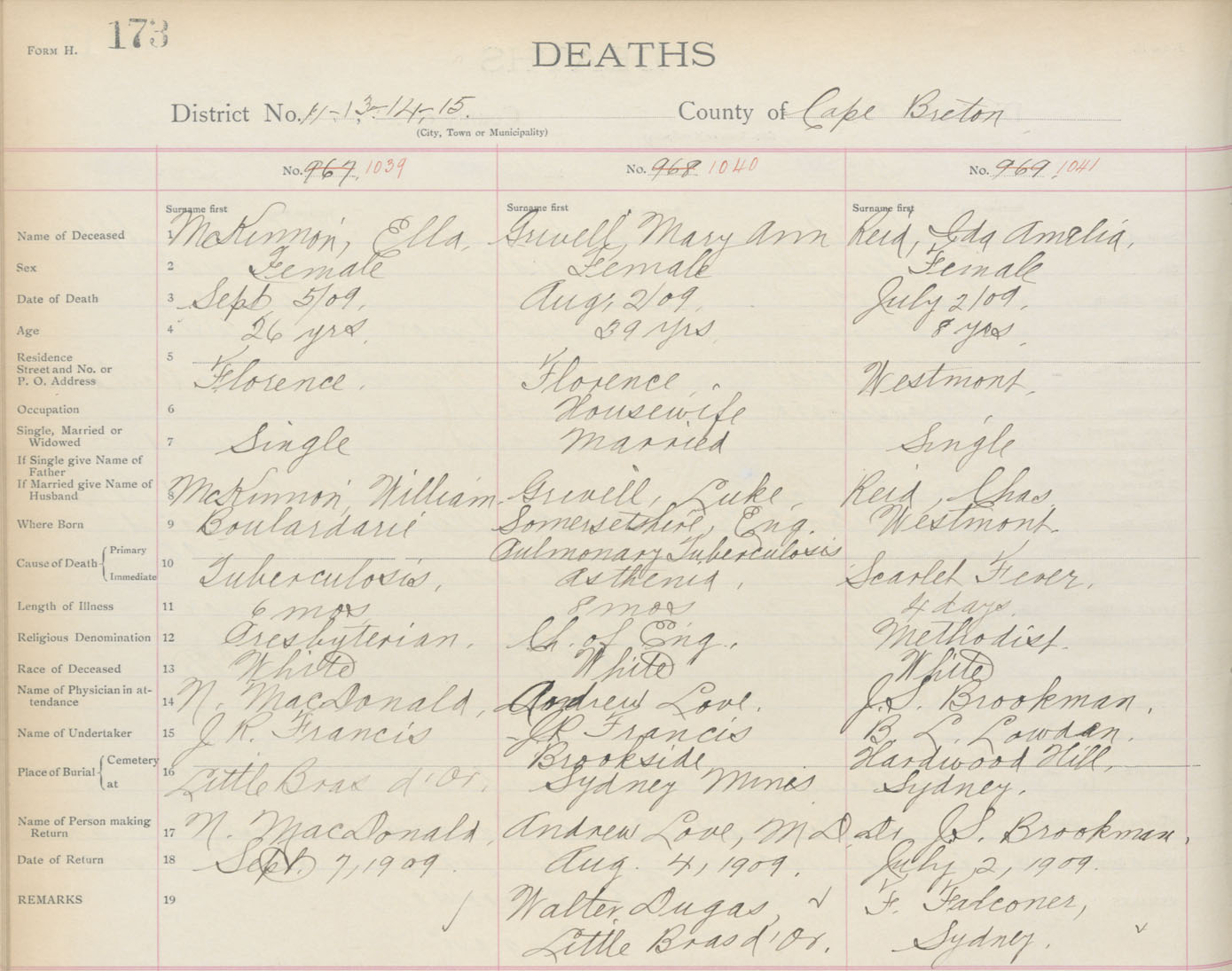 Death Registration: Year: 1909 book: 3 page: 173 number: 1041